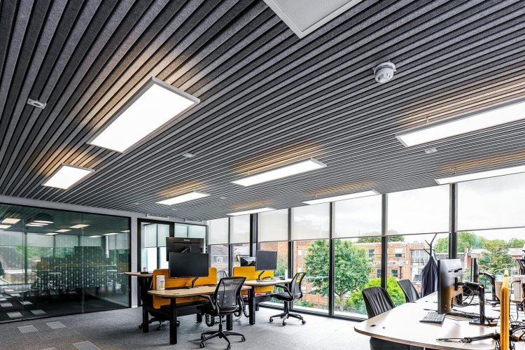 Cielorrasos acústicos de fieltro de sistema avanzado que permite controlar la acústica de cualquier espacio.