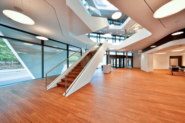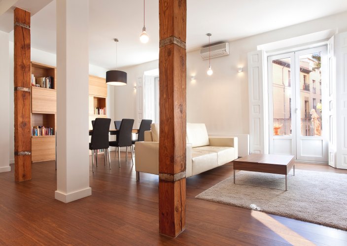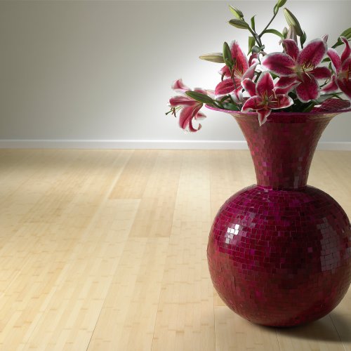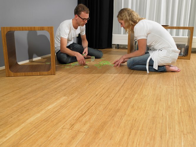 Piso de madera de lamas relativamente largas y anchas compuesto por 3 capas de bambú macizo.