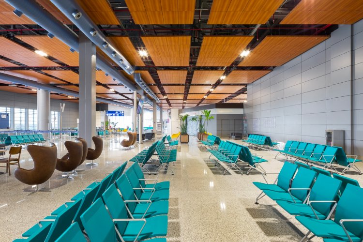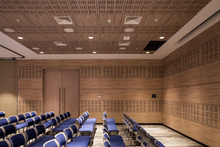 Cielo raso de madera compuesto por bandejas de madera aglomerada HR.