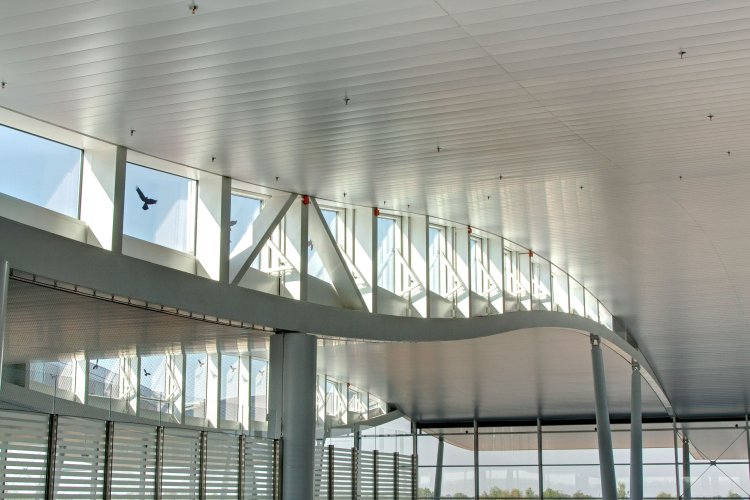 Este sistema, tiene la capacidad de instalarse curvo, ya sea adaptando el portapanel a una solución curva o con paneles curvados de fábrica. Propiedad que rompe con el tradicional cielorraso recto, para dar movimiento y volumen a obras contemporáneas.