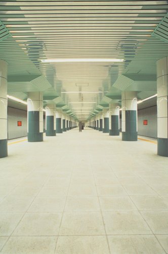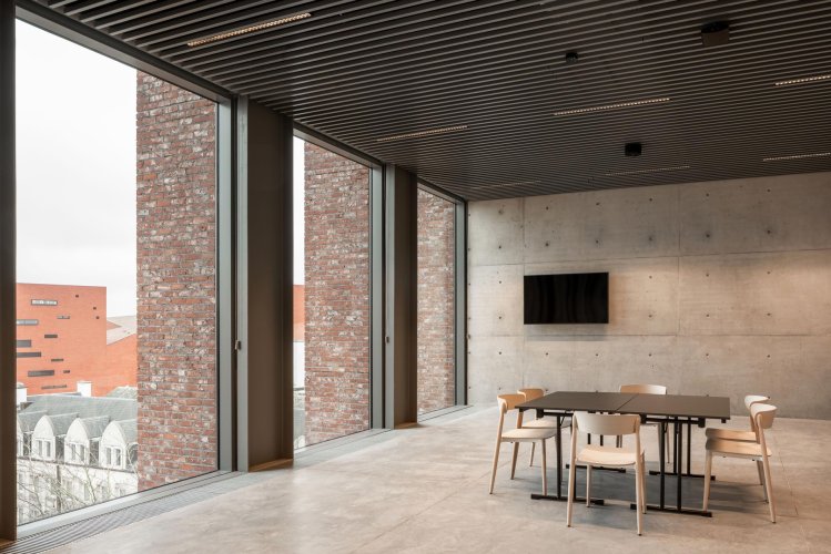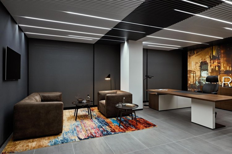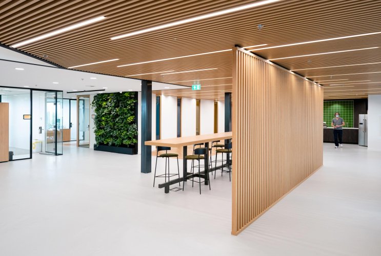 Cielorraso metálico lineal abierto que genera continuidad y profundidad, de buen desempeño acústico.