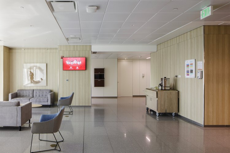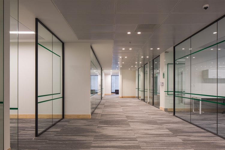 Cielorraso metálico de aspecto pulido con sistema de suspensión en forma de grilla de máxima registrabilidad.